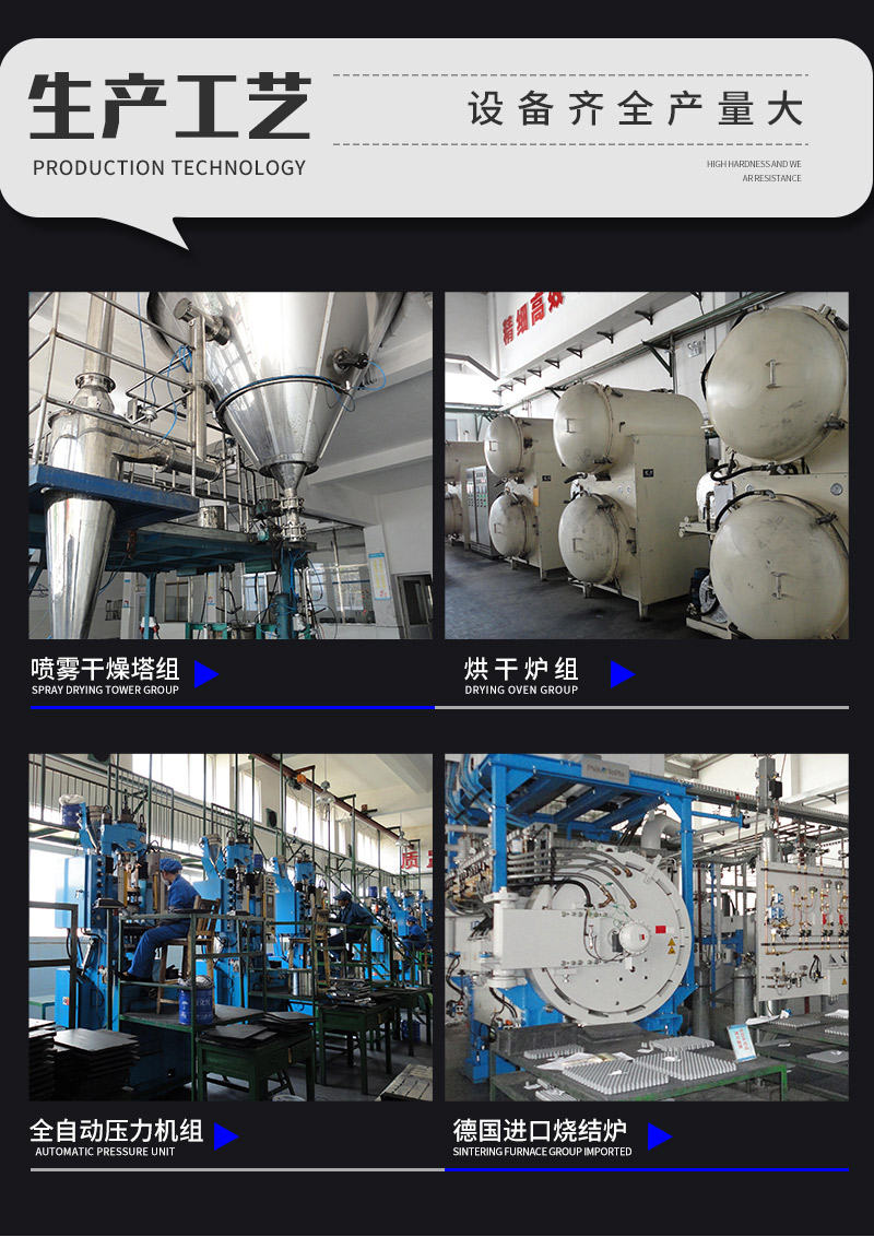 2、采用最新100MPa加壓燒結(jié)爐燒結(jié),在最后階段采用壓力燒結(jié),致密性得到了大的提高,孔隙度減少,大大地提高了產(chǎn)品的機械性能,沖擊韌性佳,不易掉塊、 沖擊次數(shù)同比提高更多。