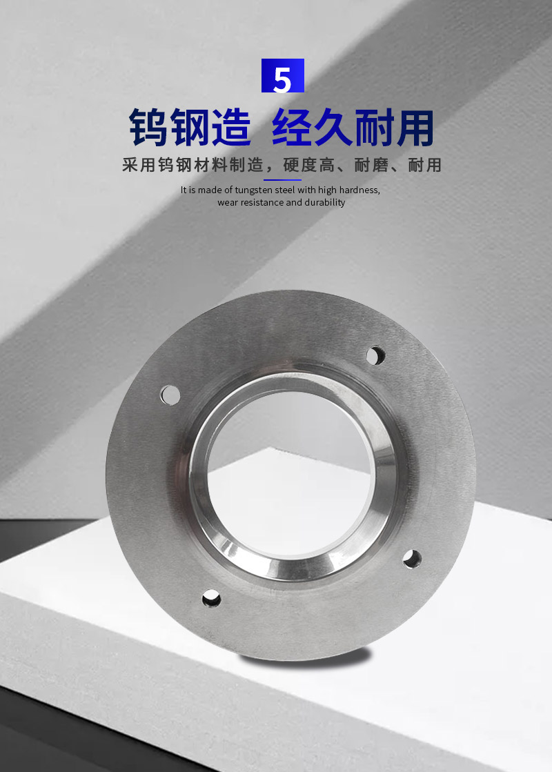 大型鎢鋼拉伸模具特大外徑750mm的壽命十幾倍乃至幾十倍,硬質(zhì)合金模具具有高硬度,高強,耐腐蝕,耐高溫和膨脹系數(shù)小,一般都是采用鎢鈷的硬質(zhì)合金。具有高抗擊韌性及抗疲勞、高強度、不易崩缺,不易斷裂,耐磨性強、不易磨損,精密度高、穩(wěn)定性強、使用壽命長等特點。